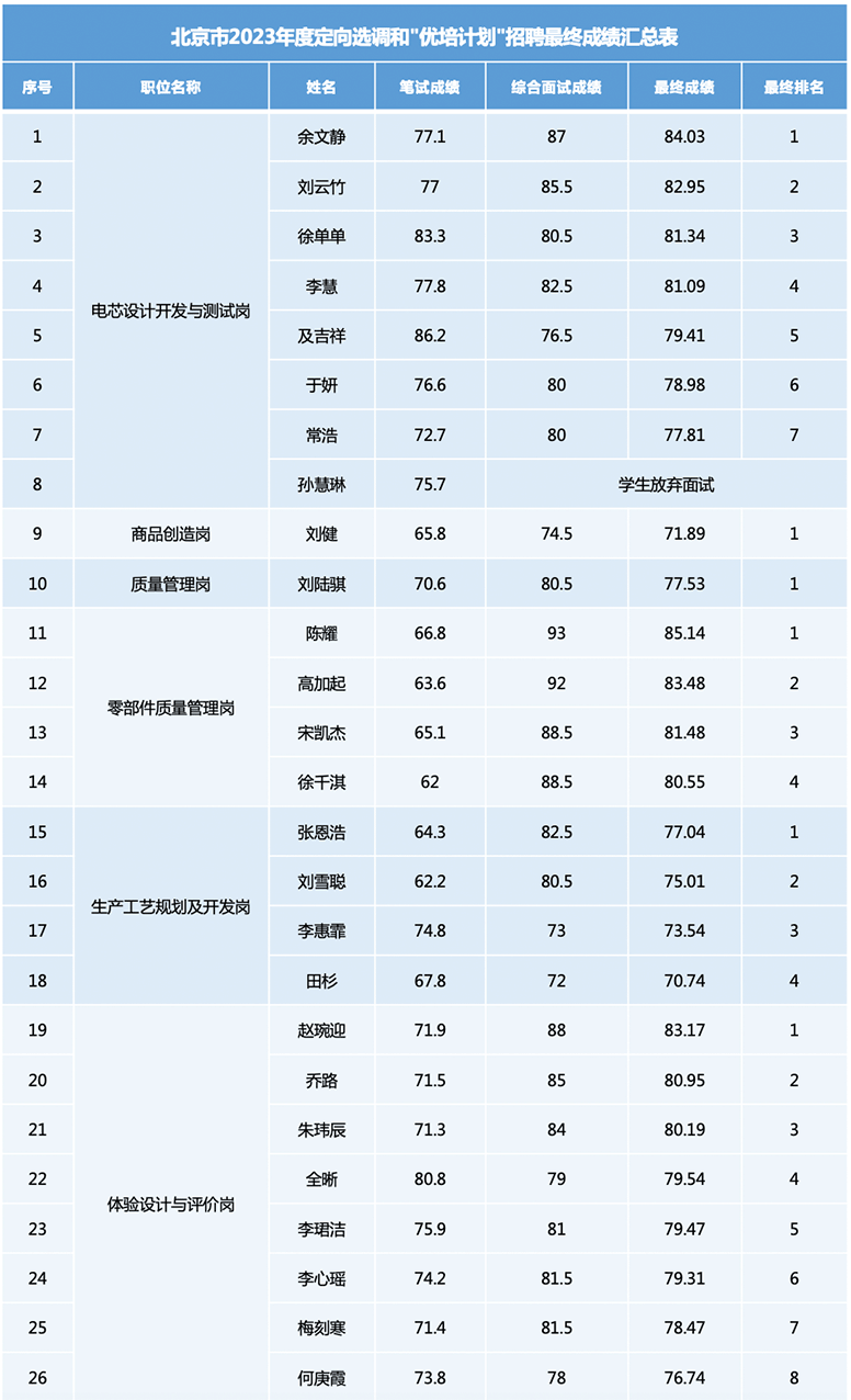 按照《北京市2023年度定向选调和“优培计划”招聘应届优秀大学毕业生工作的实施方案》的要求,现将澳门人威尼斯官网汽车股份有限公司2023年度“优培计划”招聘考生成绩予以公示,公示期为2023年1月11日至2023年1月17日,公示期间如有异议,可拨打电话010-5397 0220。公示期满后,按照计划录用人数,根据最终成绩从高到低的顺序依次确定参加体检和考察的人选。体检、考察相关事宜另行通知。